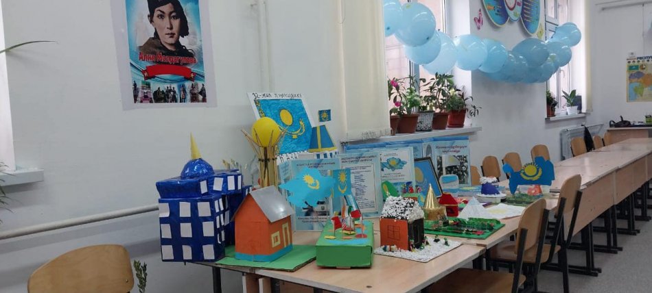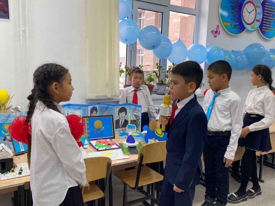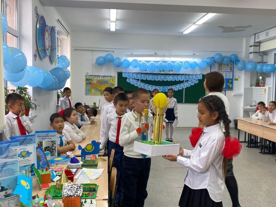 "Тәуелсіздігім- терегім" атты тарихи қолөнер көрмесі ашық тәрбие сағаты ретінде өтілді. Сабақ барысында оқушылар өздері жасаған қолөнерлерімен таныстырып, банкадағы суға бояу құю арқылы көк туымызды бейнелейтін тәжірибе жүргізді.
