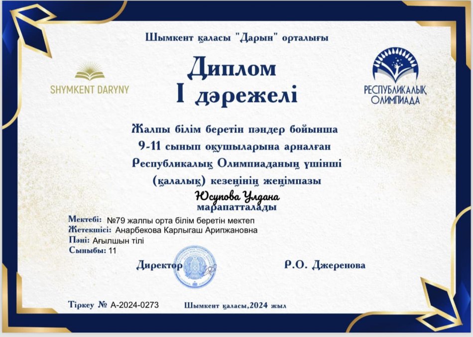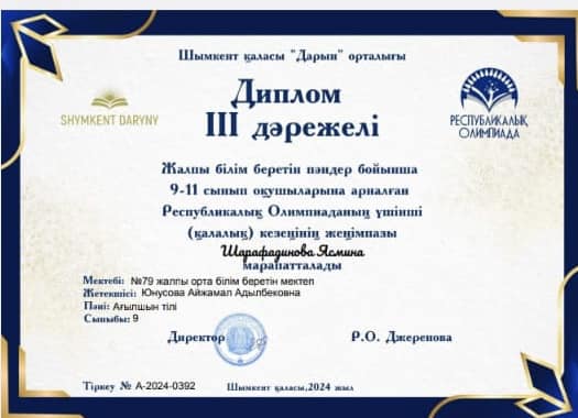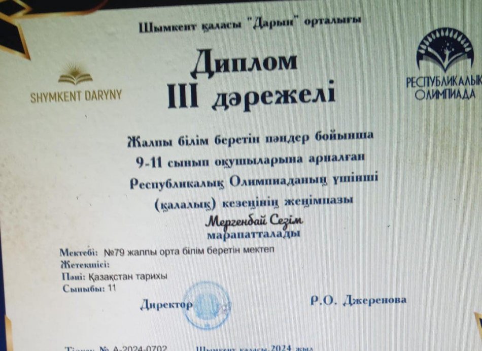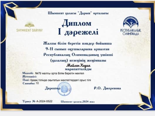 Шымкент қаласы білім басқармасына қарасты №79 жалпы орта білім беретін мектебінің ұстаздары мен озат оқушылары «Дарын» орталығының ұйымдастырумен өткен жалпы білім беретін пәндер бойынша 5-11 сынып оқушыларына арналған Республикалық олимпиаданың үшінші (қалалық) кезеңінің жеңімпаздарын мектеп ұжымы атынан құттықтаймыз!